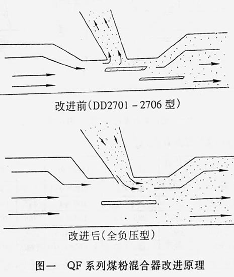 究其原因主要是:DD27系列煤粉混合器結(jié)構(gòu)設(shè)計尚欠合理,該混合器的雙托板結(jié)構(gòu)阻力大,造成落粉管內(nèi)部呈現(xiàn)正壓,使煤耗粉從給粉機(jī)下落時被下部正壓托住,形成托粉現(xiàn)象,影響給煤均勻性。JN—QF系列全負(fù)壓煤粉混合器把雙層托板改成單托板(參見圖一),又在落粉管與混合器聯(lián)接處的后壁加一塊弧形鋼板插入煤粉混合器內(nèi)部一定深度,使流經(jīng)的一次風(fēng)對落粉管產(chǎn)生引流作用,徹底消除了托粉現(xiàn)象。同時減輕給粉機(jī)下部垂直管段到與一次風(fēng)管連接處的磨損,大大延長使用壽命。